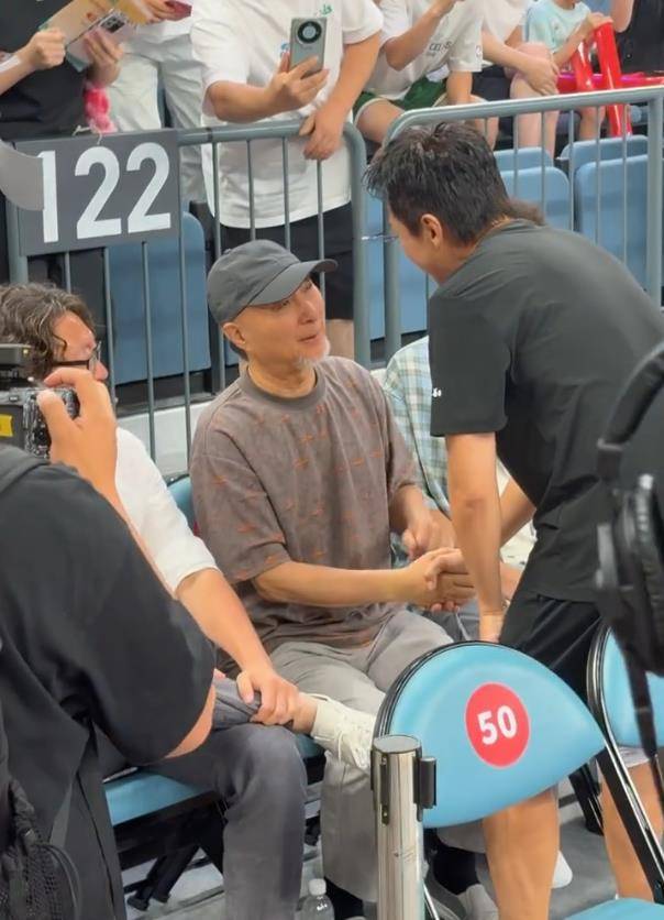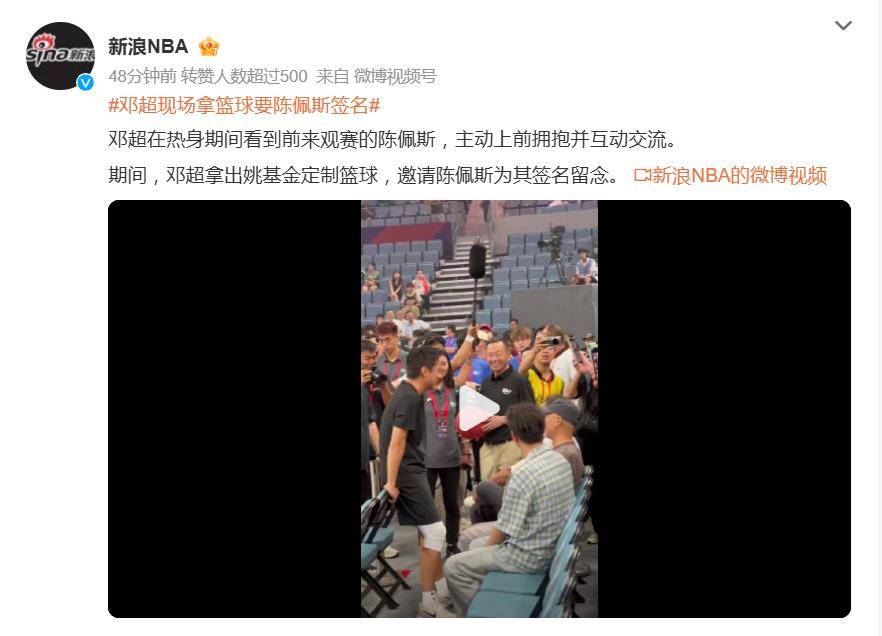 热身环节,邓超突然发现观众席上的喜剧大师陈佩斯,立刻暂停训练,一路小跑冲过去拥抱,活脱脱一副“粉丝见偶像”的激动模样。更绝的是,他还掏出一个印有“姚基金”的定制篮球,请陈佩斯签名留念,现场氛围瞬间从篮球赛切换成“喜剧人团建”。