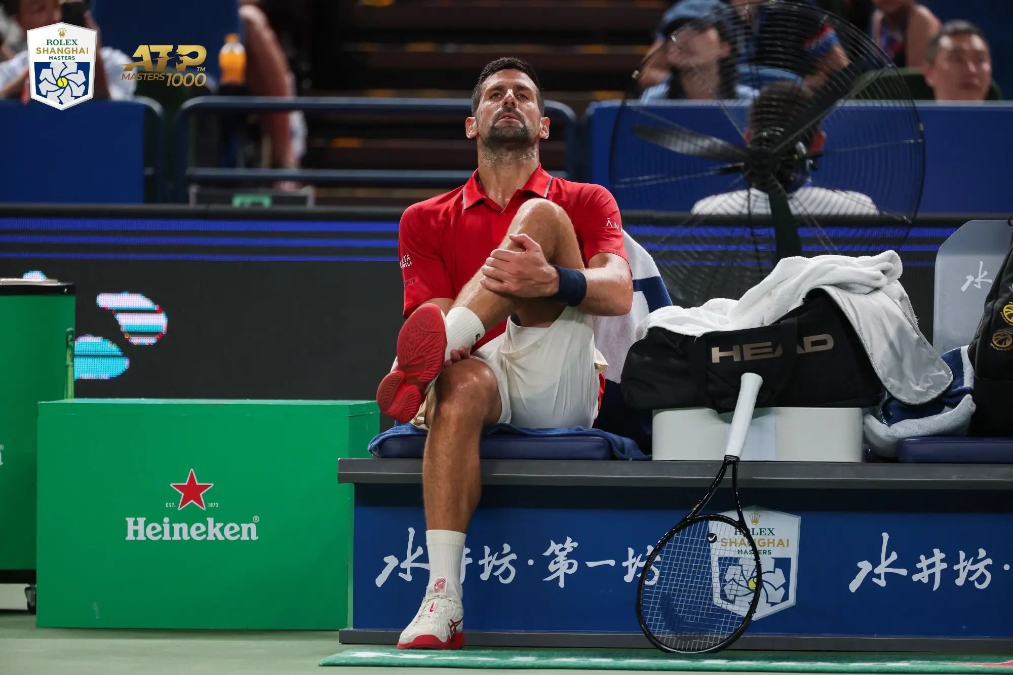 小腿肌肉在第一盘第四局就已拉伤,对手是年轻他11岁、体能充沛的西班牙悍将穆纳尔,而上海的湿热天气如同一个巨大的蒸笼,消耗着每一分体力与意志。丢掉第二盘后,这场比赛对德约来说几乎是一场看似毫无胜算的战斗。