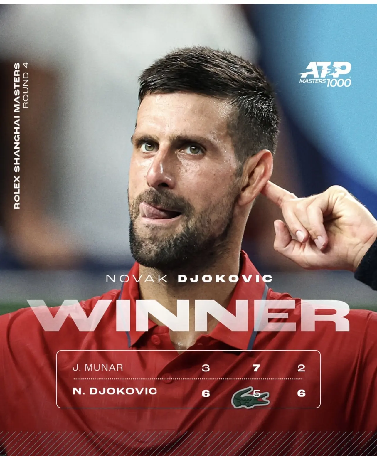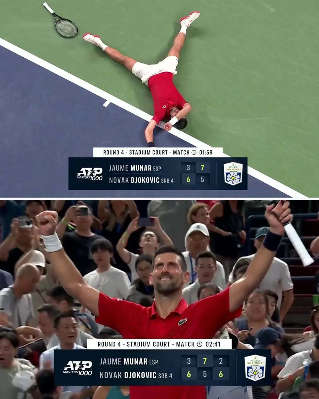 昨天晚上,上海大师赛第四轮德约科维奇对阵穆纳尔的比赛第二盘结束的那一刻,塞尔维亚球王躺倒在上海旗忠网球中心球场的硬地上,汗水浸透衣衫,仿佛已经没有力气起身。几乎所有目睹这一幕的人都认为,他的上海大师赛之旅即将画上句号。