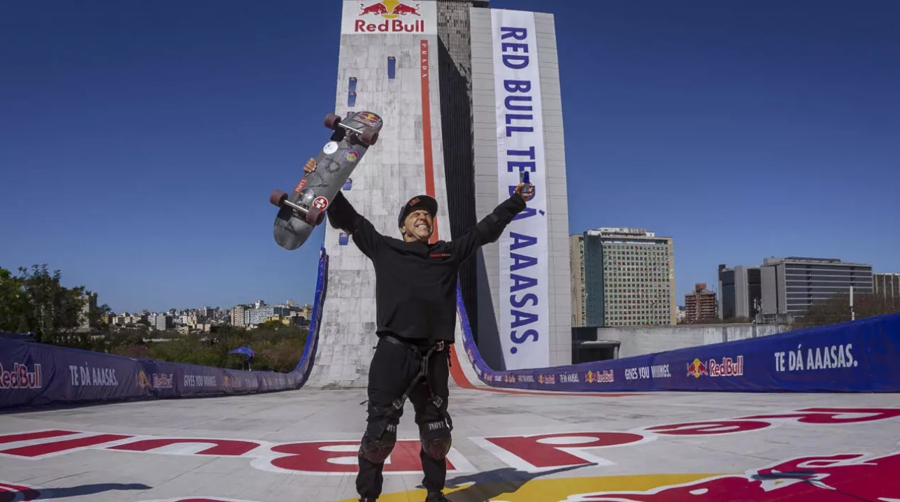 这位勇敢的滑手从60米高处滑下,在壮观的下滑过程中达到了103.8公里/小时的最高速度。这项名为“红牛大楼滑降”的活动在巴西阿雷格里港举行。