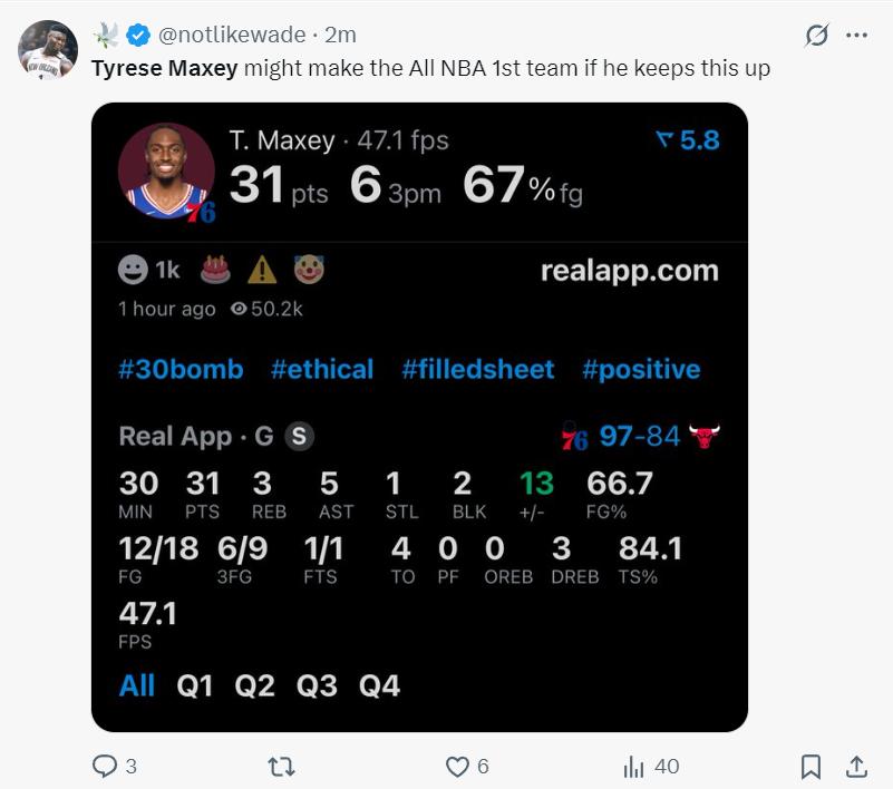 第三节马克西效率略有下滑单节8中4+三分2中1拿到9分1篮板1助攻1盖帽,三节打完再度拿到30+的数据,31分5助攻3篮板1抢断2盖帽,他才是费城的第一核心。