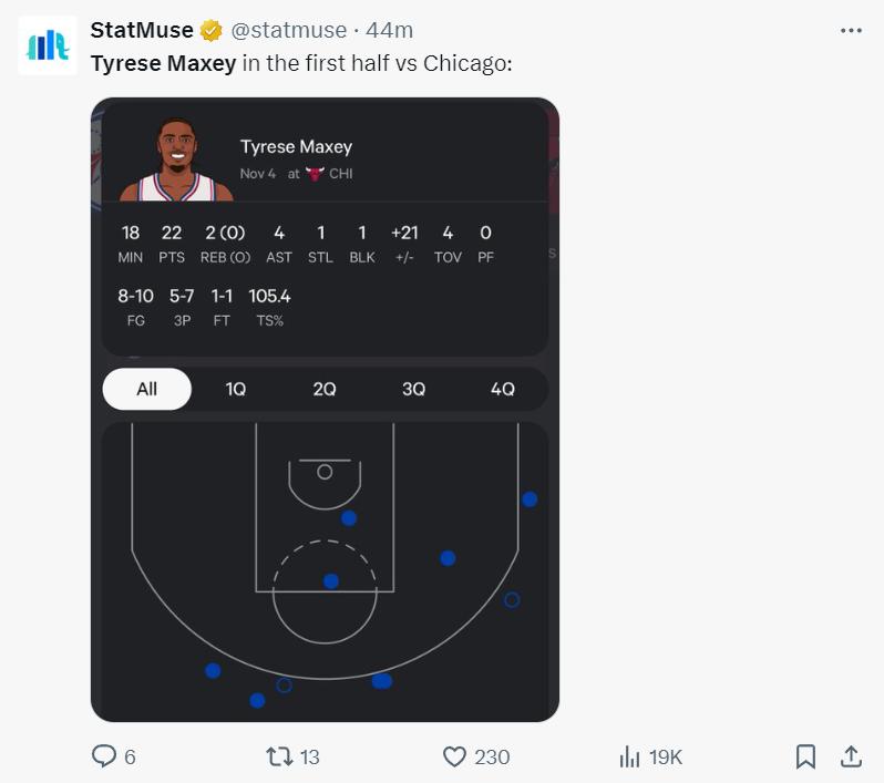 全场比赛马克西39分钟,26中14,三分10中6,拿到39分5篮板5助攻,命中率53.8%,三分命中率60%,这是马克西本赛季连续第七场25+,也是本赛季第四场拿到30+。