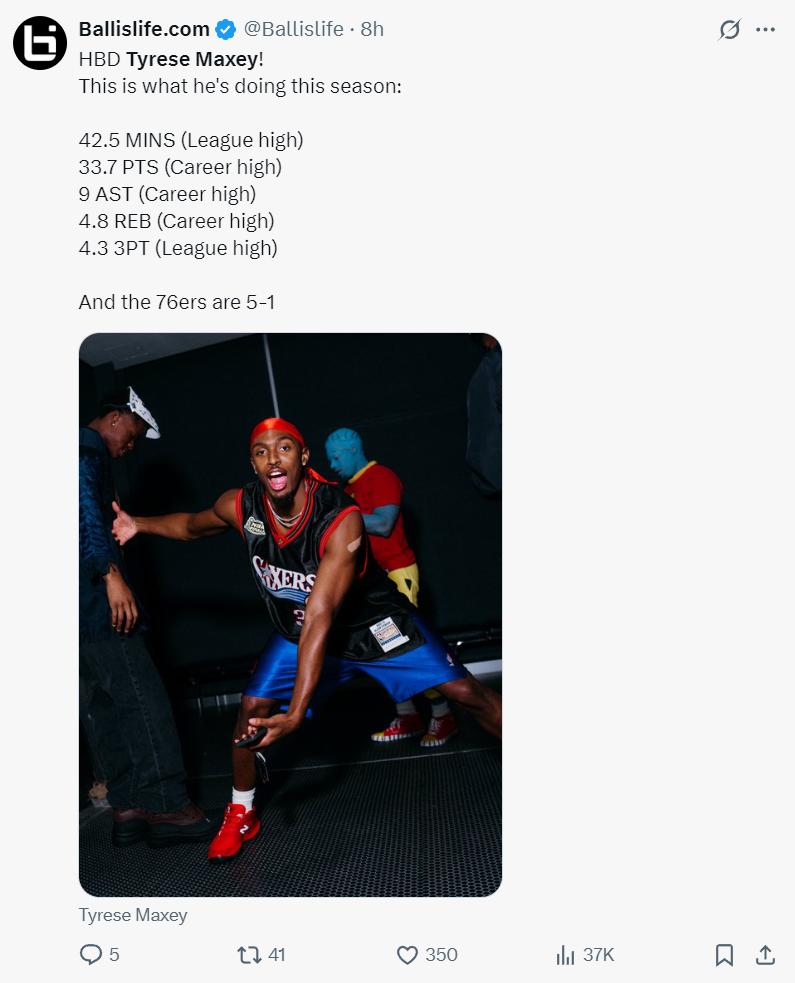 这个夜晚是马克西的25岁生日之夜,他此前的6场比赛,场均42.5分钟,拿到33.7分9助攻4.8篮板4.3个三分球,马克西开赛连续6场25+也比肩05-06赛季的艾弗森。