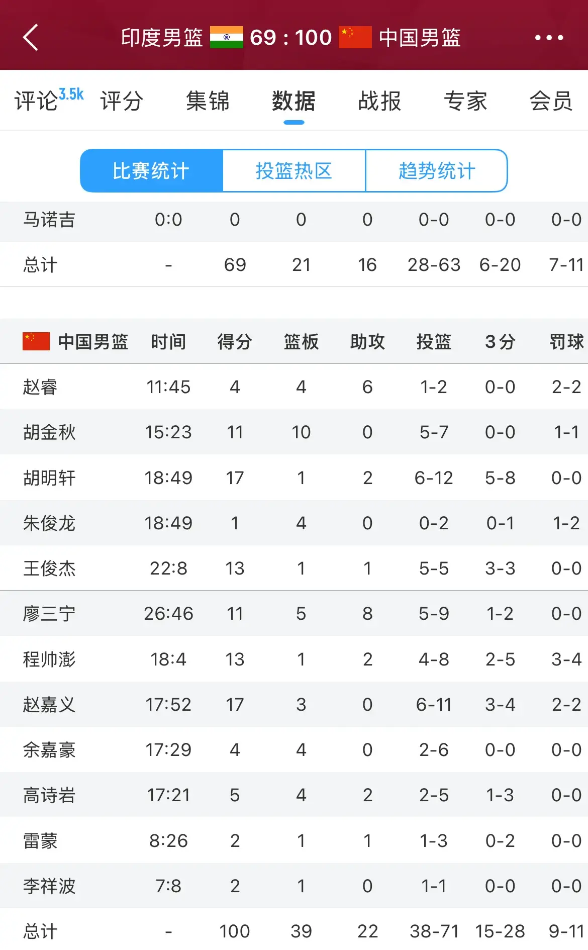 从数据统计上看,印度主帅的点评还是非常中肯的!胡明轩的三分球是8投5中,王俊杰则是3投3中。整体上,中国男篮的3分球是28投15中,命中率超过了50%!确实把对手的防线给击穿了。