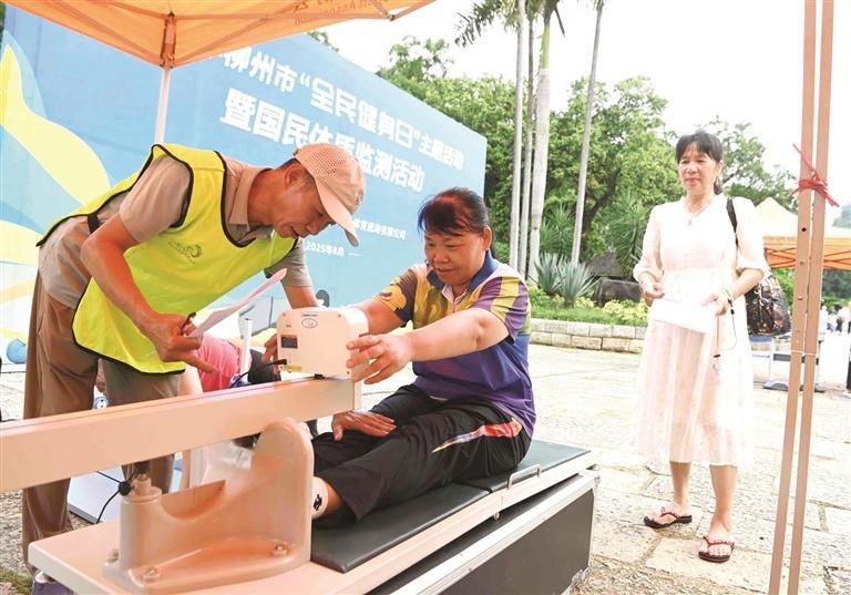 在龙潭公园,2025年柳州市“全民健身日”主题活动暨国民体质监测活动吸引市民和游客参与。现场,身高测试、肺活量测试、闭眼单足站立测试等监测项目让参与者一站式了解自己身体的形态、机能。