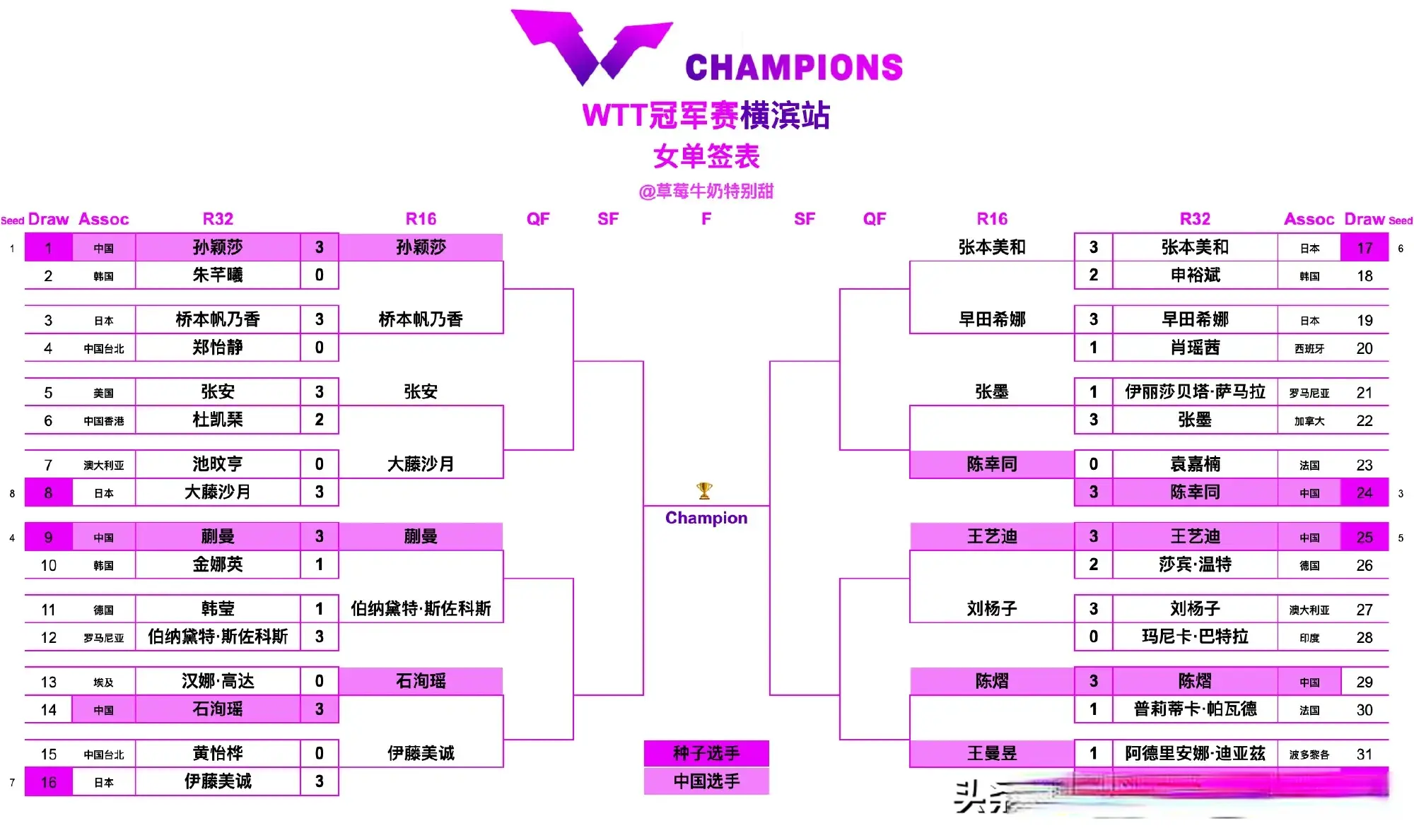 北京时间8月8日,横滨冠军赛迎来第二个比赛日,今天继续进行男女单打1/16决赛,今天结束8场女单1/16决赛,女单16强全部产生,中日大获全胜,国乒参赛的7名队员全部晋级16强,日本队参赛的5名队员全部晋级,韩国队参赛的三名选手均遭遇一轮游,全军覆没,无人晋级16强。