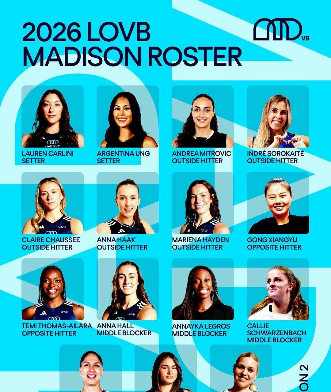 随着龚翔宇加盟消息的公布,LOVB联赛2026赛季各队的最新阵容也浮出水面。新赛季共有20名新援加盟联赛,除了龚翔宇之外,还有两届奥运选手、巴西女排的卡罗尔和荷兰女排的安妮·布伊吉斯加盟LOVB内布拉斯加队。加拿大女排也有四名国手登陆LOVB联赛,其中安德莉娅·米特罗维奇与龚翔宇一同加盟了LOVB麦迪逊队。此外,多名美国大学排坛新秀结束海外生涯回归加盟,为联赛注入了新鲜血液。