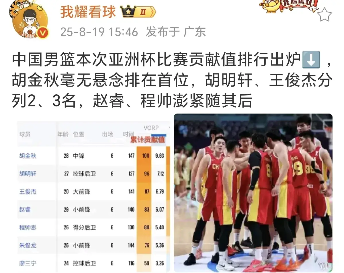 中国男篮中锋胡金秋在亚洲杯贡献值中排名榜首是天经地义的。