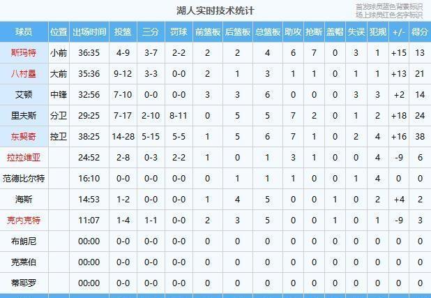 湖人:东契奇38分6板7助、里夫斯24分5板7助2断、八村塁21分3板1助、艾顿14分6板、斯玛特13分4板6助7断、拉拉维亚6分1板3助、克内克特3分5板、海斯2分5板、范德比尔特1板1助