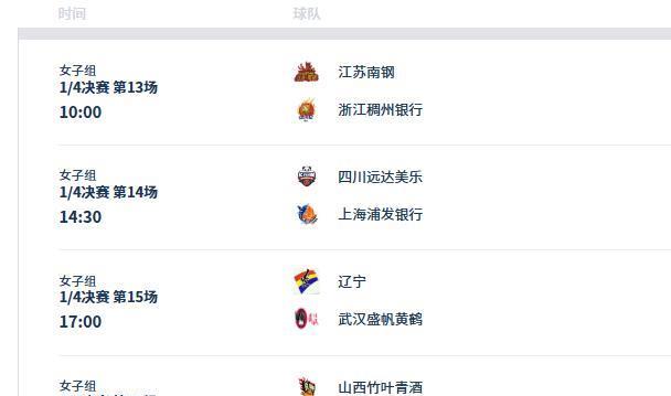 随之而来的则是赛程也定了,4场四分之一决赛都将会在10月15日进行,上午10点,江苏女篮对阵浙江女篮,下午14:30,四川女篮对阵上海女篮。下午17点,辽宁女篮对阵武汉女篮。晚上19:30,山西女篮对阵山东女篮。