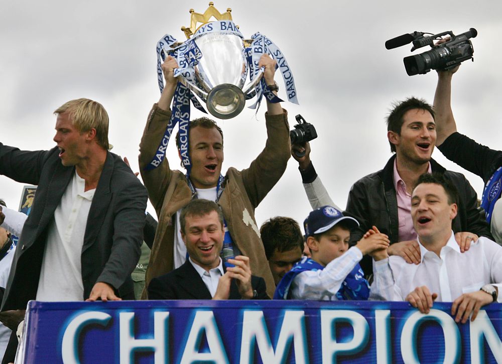 这是2005年5月22日,切尔西队球员罗本(上左二)与队友兰帕德(上右)、特里(下右)、俱乐部老板阿布拉莫维奇(下左一)带着2004-2005赛季英超联赛冠军奖杯在伦敦参加庆祝游行的资料照片。这也是切尔西历史上首个英超联赛冠军。新华社/路透