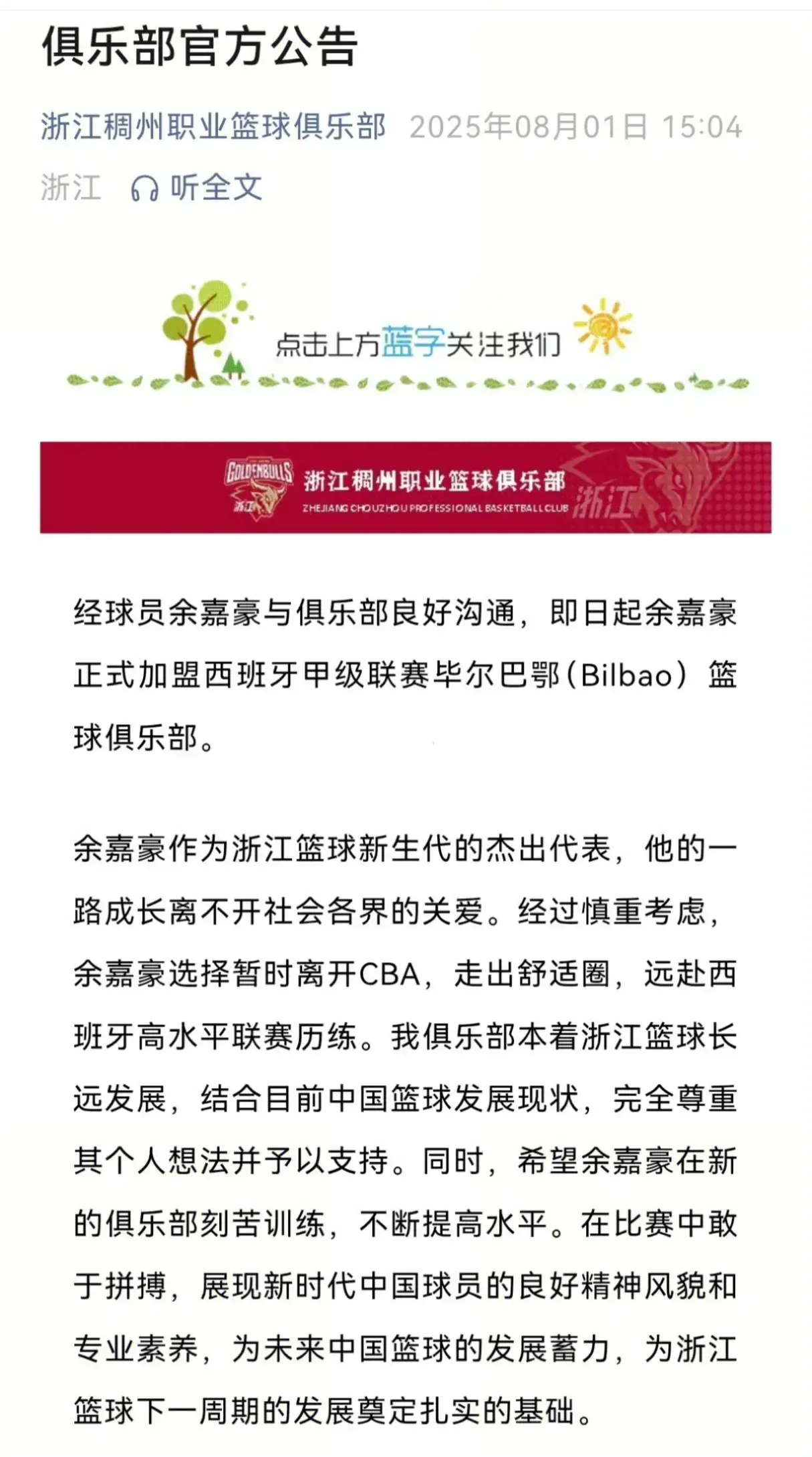 浙江稠州俱乐部官方发布公告,A类合同到期的球员余嘉豪,即日起正式加盟西班牙甲级联赛的毕尔巴鄂队。