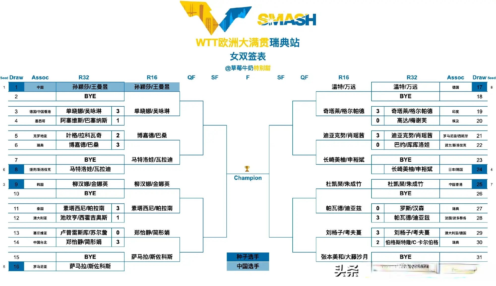 北京时间8月20日凌晨,欧洲大满贯女双首轮比赛结束,女双16强全部产生。本站比赛有多对跨协会组合参赛,大家整体实力伯仲之间,女双前8号种子首轮比赛轮空,直接晋级16强。本站比赛国乒只派出了王曼昱/孙颖莎一对组合参赛,两人是本站比赛的头号种子,首轮比赛轮空。经过两天比赛的激烈比拼,8对组合战胜各自对手取得比赛胜利,顺利晋级16强。