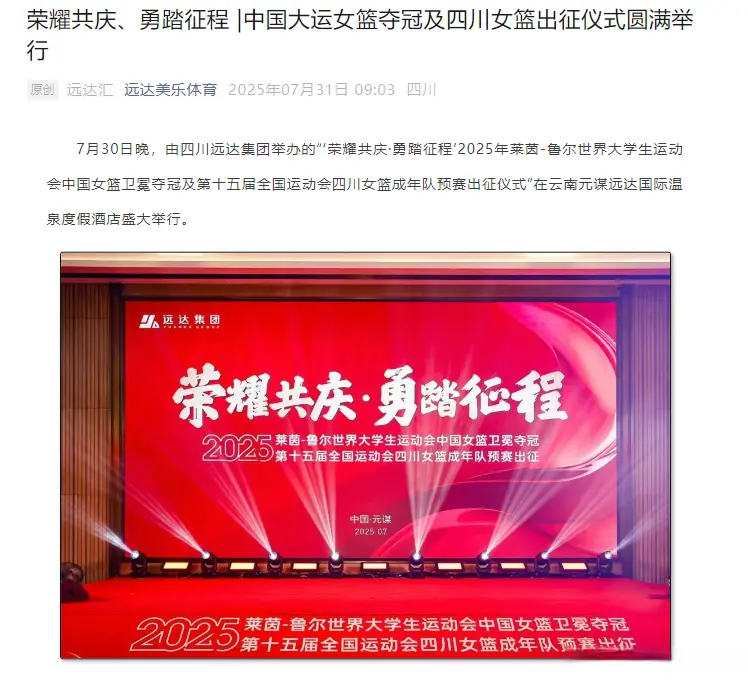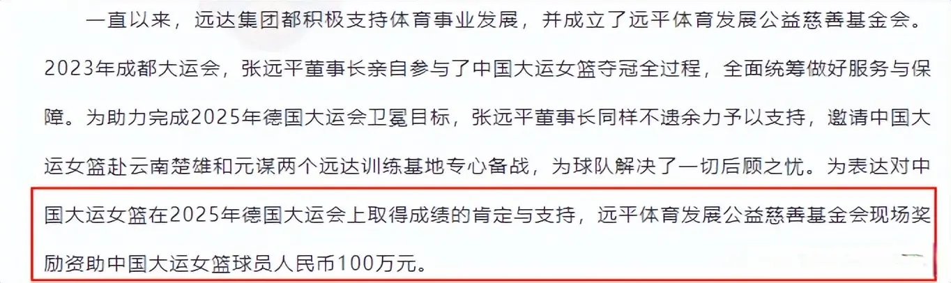 根据四川远达美乐体育的消息,“为表达对中国大运女篮在2025年德国大运会上取得成绩的肯定与支持,远平体育发展公益慈善基金会现场奖励资助中国大运女篮球员人民币100万元。”