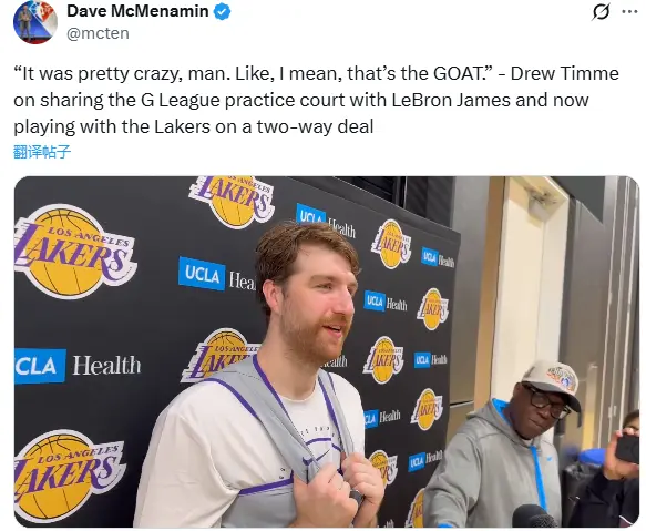 北京时间11月26日,湖人官方正式宣布,球队用一份双向合同签下内线球员德鲁-蒂米,并且裁掉了科洛科;湖人新援蒂米在训练后接受采访,他表示在发展联盟与詹姆斯一起打球太疯狂了。