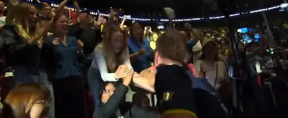 与家人们一一握手、击掌后,小莫回到球台变接受球迷们的欢呼,小莫这时候还捂头不敢相信。