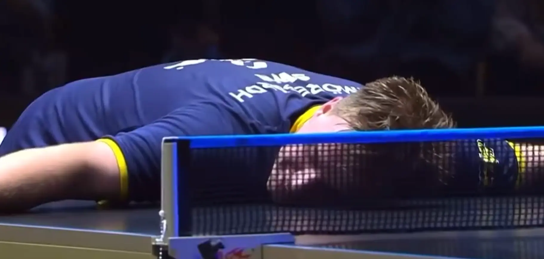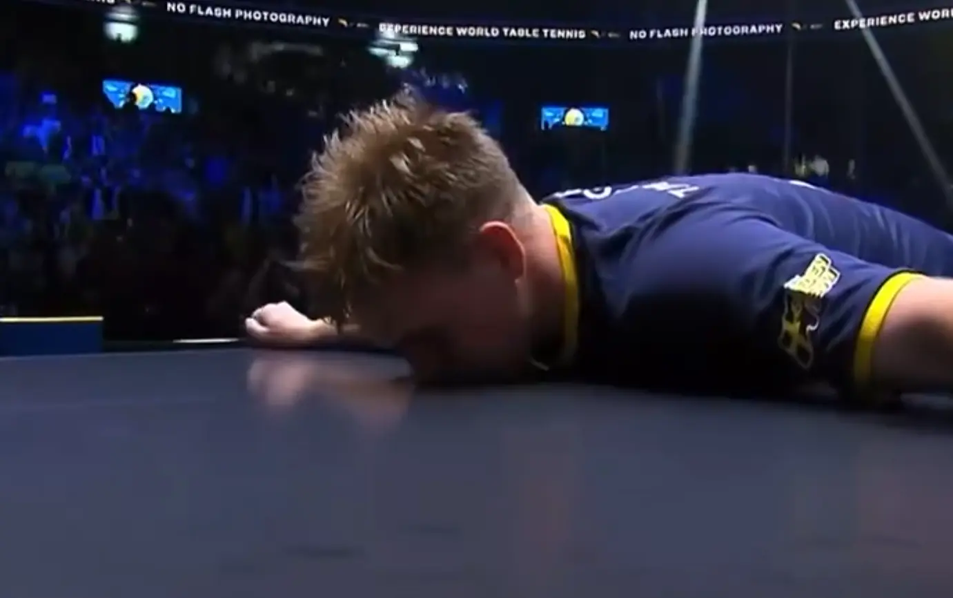 小莫直接倒在了球台上,缓了几秒后他亲吻了球台,球拍与球台都进行了亲吻,小莫还是在激动之中。