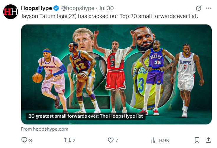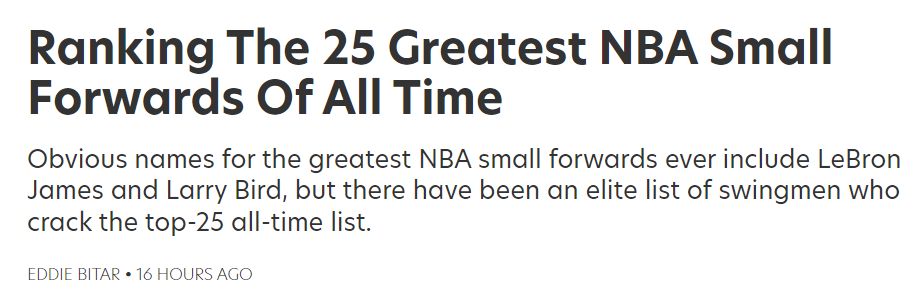 两天之前,美国媒体HoopsHype评选了NBA历史前20大小前锋: