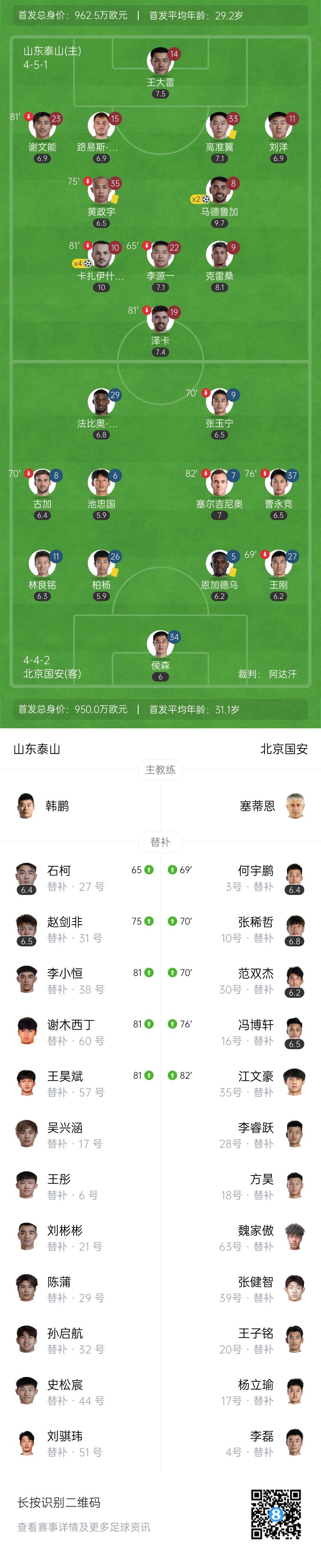 第15分钟,池忠国回传失误,克雷桑传中,卡扎伊什维利包抄破门!山东泰山1-0领先北京国安↓