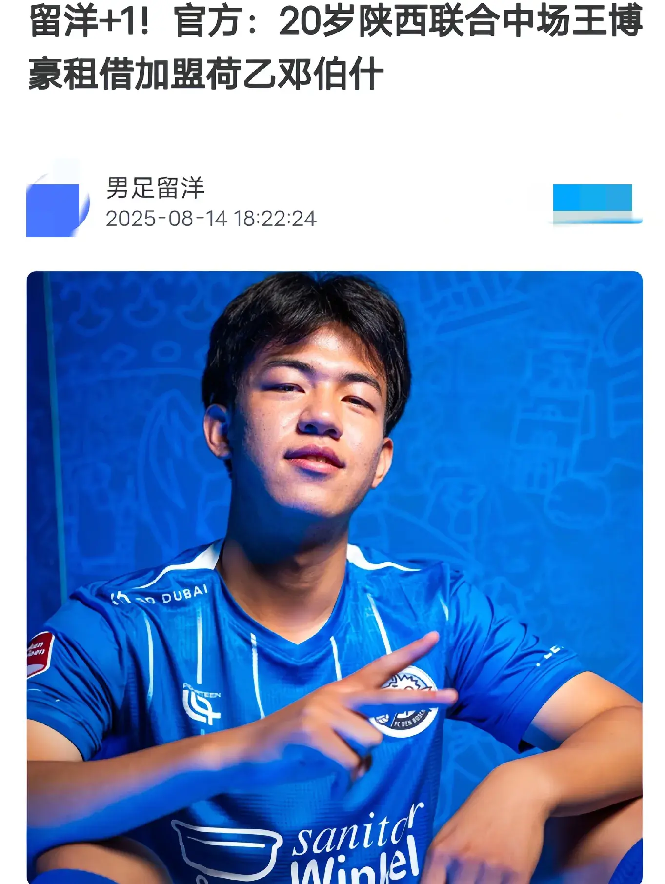 2,王博豪,8月14日荷乙邓伯什俱乐部官宣,中国20岁小将王博豪租借加盟球队。王博豪将代表邓伯什一线队征战25-26赛季荷乙联赛。王博豪司职边锋和前锋,身高1米87,曾效力过中甲延边龙鼎、中甲陕西联合。曾入选过05年龄段U20国青队。王博豪是被荷乙邓伯什俱乐部技术总监看中,并最终加盟这支以青训为主荷乙球队。