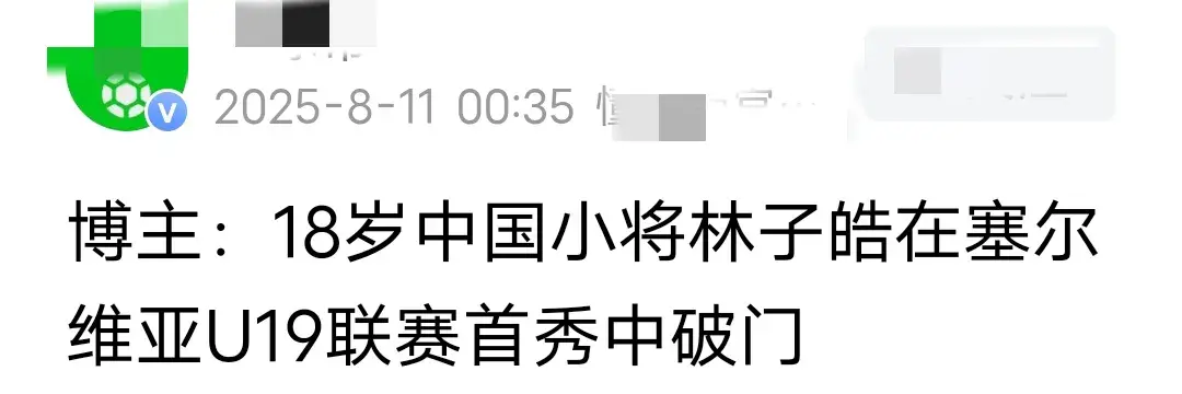 6,林子皓,出生于2007年,场上位置:前锋/边锋,今年8月林子皓加盟塞尔维亚甲级(二级)联赛沃日多瓦茨U19A队,并在首场塞尔维亚U19一级(顶级)联赛,他就首发出场对阵塞超豪门贝尔格莱德红星U19A队,本场比赛沃日多瓦茨U19队1-2输给贝尔格莱德红星U19,但中国小将林子皓打进1球。林子皓目标是下半年代表沃日多瓦茨一线队征战塞甲(二级)联赛。