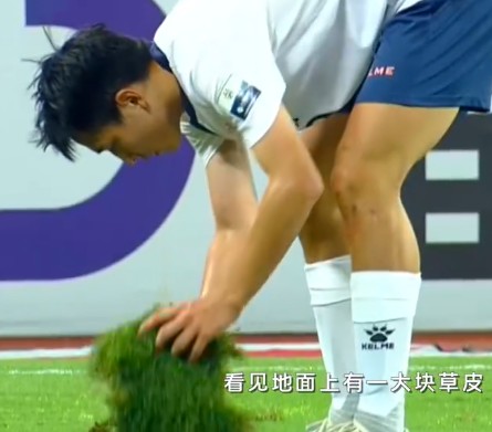 看见地面上有一大块草皮掀翻起来了,可能后面的球员会踩到,可能会受伤崴脚什么的,所以我就把它铺了起来。场下他们说你铺草坪火了,我一看应该是有很多赞吧。