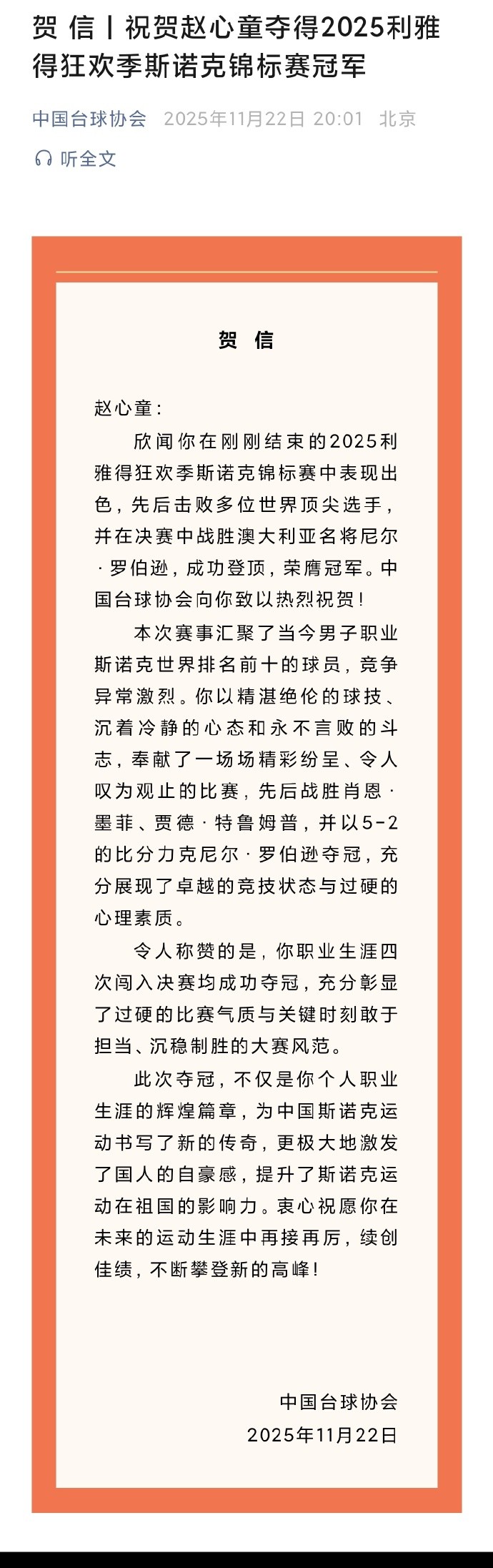 欣闻你在刚刚结束的2025利雅得狂欢季斯诺克锦标赛中表现出色,先后击败多位世界顶尖选手,并在决赛中战胜澳大利亚名将尼尔-罗伯逊,成功登顶,荣膺冠军。中国台球协会向你致以热烈祝贺!