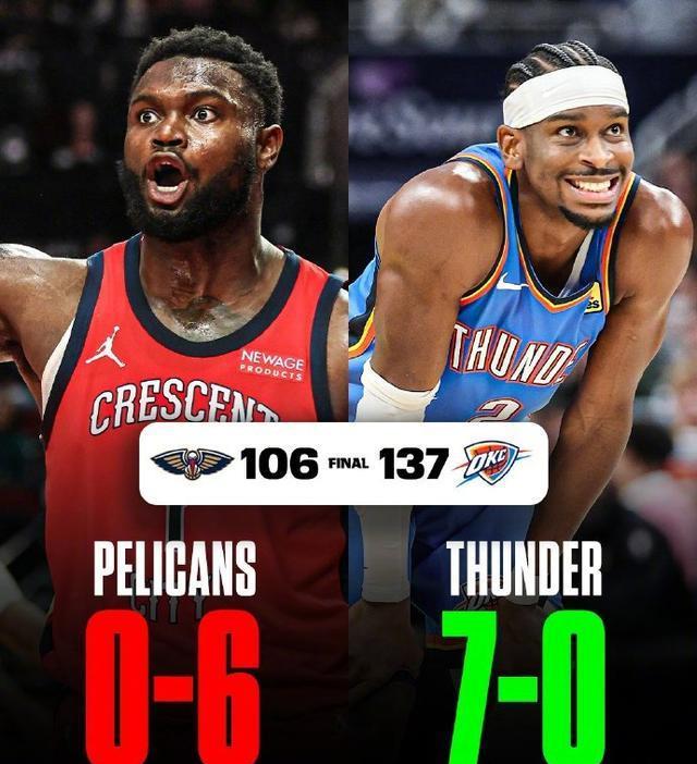 雷霆今天在主场以137-106狂胜鹈鹕,豪取7连胜,也送给鹈鹕6连败。雷霆本赛季开局战绩为7胜0负,至今还没有输过。值得一提的是,雷霆上赛季也取得了7胜0负的开局战绩,由此成为历史上第三支连续两个赛季7胜0负开局的球队,比肩为93-95赛季火箭和63-65赛季凯尔特人。