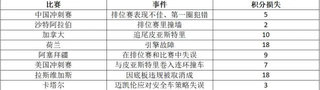 两位迈凯伦车手在自己可以控制和超出控制情况下的积分损失相对平等。皮亚斯特里原本可以避免47分损失,而其他不公平情况导致他丢掉40分;诺里斯自己送出29分,另外43分则超出他的能力范围。不过,这还没有考虑到一些有关联的形势变化,例如皮亚斯特里失去的胜利直接被诺里斯拿到(如在银石),或者由维斯塔潘(如在卡塔尔)继承。