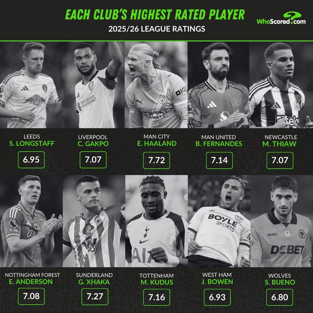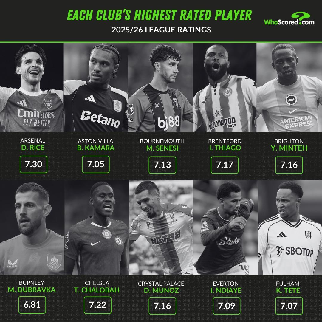 虎扑12月02日讯 WhoScored数据统计,盘点本赛季至今英超各支球队评分最高球员。