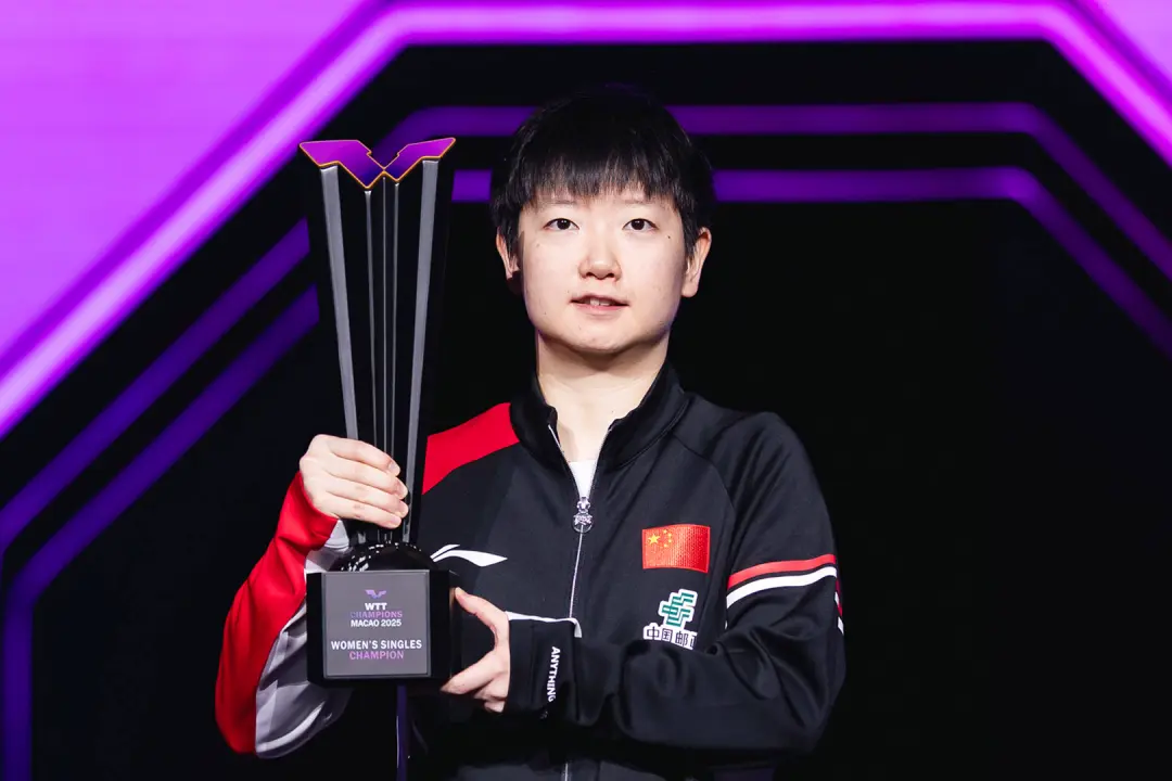 这是孙颖莎斩获的又一座WTT冠军赛奖杯。向观众致谢后,她将这份荣耀“收入熠熠生辉的奖杯陈列柜”:如今她已拥有七座WTT冠军赛奖杯(其中三座来自澳门),WTT系列赛单打冠军总数增至17座。