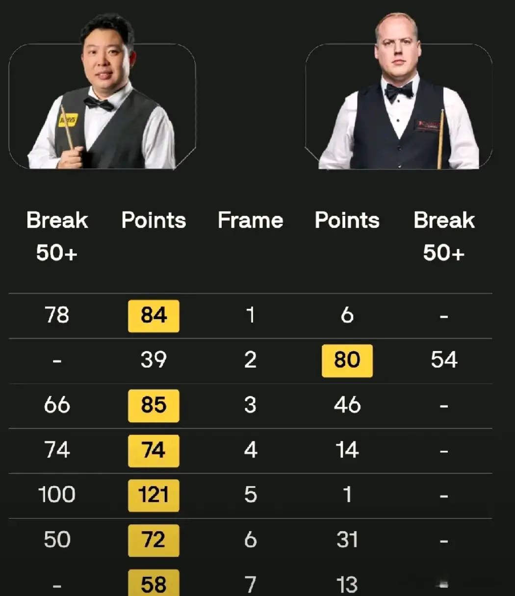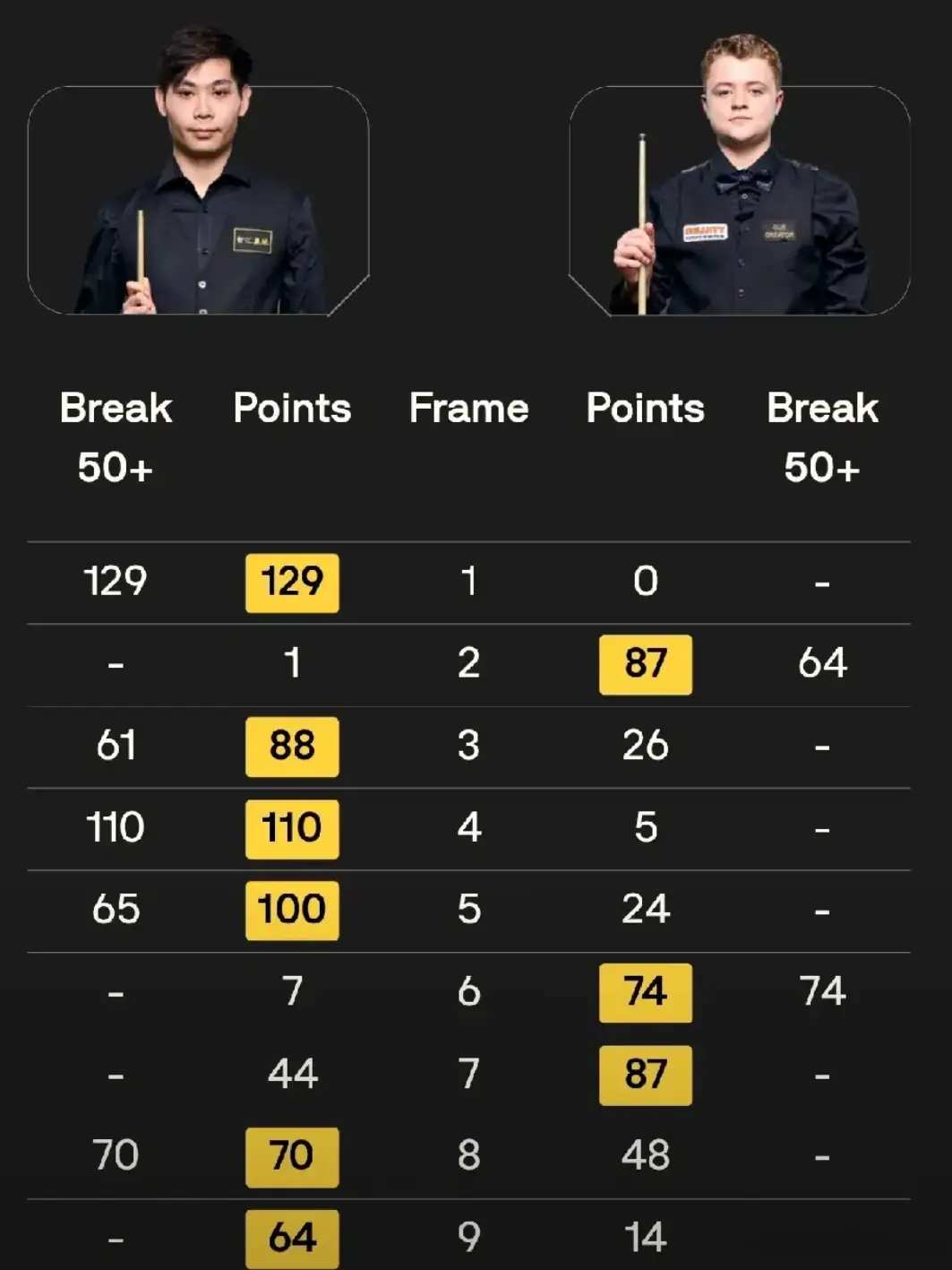 龙泽煌面对的是亚伦-希尔,本场比赛龙泽煌的手感相当火爆,开局打出4杆50+,直落五局以5-0拿到了赛点,第六局亚伦-希尔单杆致胜87分稳稳拿下避免被零封。第七局龙泽煌打出单杆50+以6-1结束战斗,赢得非常漂亮!