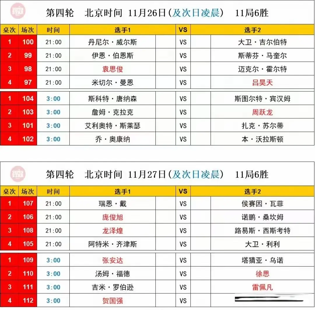 北京时间11月26日,斯诺克英锦赛资格赛第三轮已经全部比拼结束,中国军团发挥出色,9人完成突围杀进第四轮也就是决胜轮,那就是排名赛冠军雷佩凡和张安达领衔,其余7人是徐思,龙泽煌,吕昊天,周跃龙,袁思俊,庞俊旭和贺国强,有新人也有老将这样的战绩非常抢眼,接下来将全力以赴的冲击16个正赛席位,在第三轮中几场焦点大战引发关注,新星贺国强6-3淘汰了曾经击败丁俊晖的小将穆迪,张安达火力全开6-1横扫阿兰-泰勒,庞俊旭非常的6-4大逆转淘汰了海菲尔德!