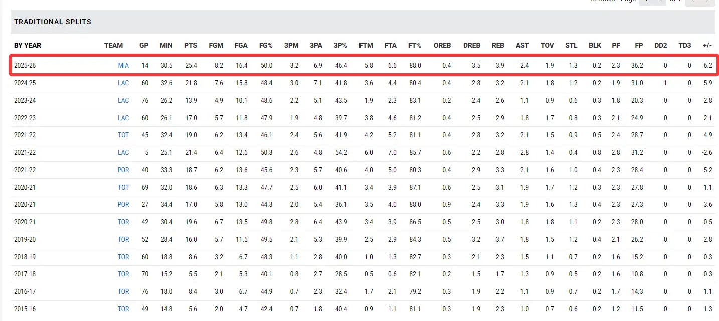 而且本赛季鲍威尔场均30.5分钟,拿到25.4分3.8篮板2.3助攻1.3抢断,命中率50%,三分命中率46.4%,正负值+6.2,他帮助热火拿到10胜4负的战绩,已经8场25+。快船记者晒出他这个数据暗示对休赛期用他换科林斯不满。