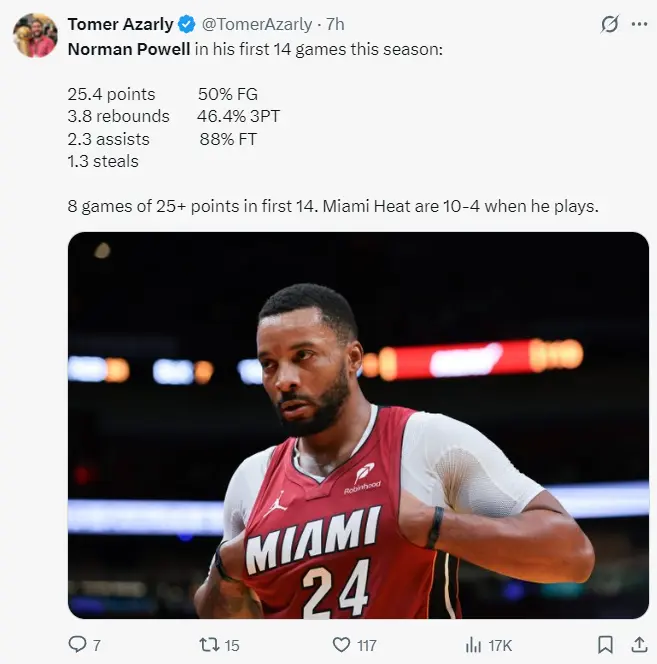 美媒写道:热火队史只有詹姆斯、韦德赛季平均达到过25分,目前鲍威尔场均超过25分,他有希望成为热火队史第三人。