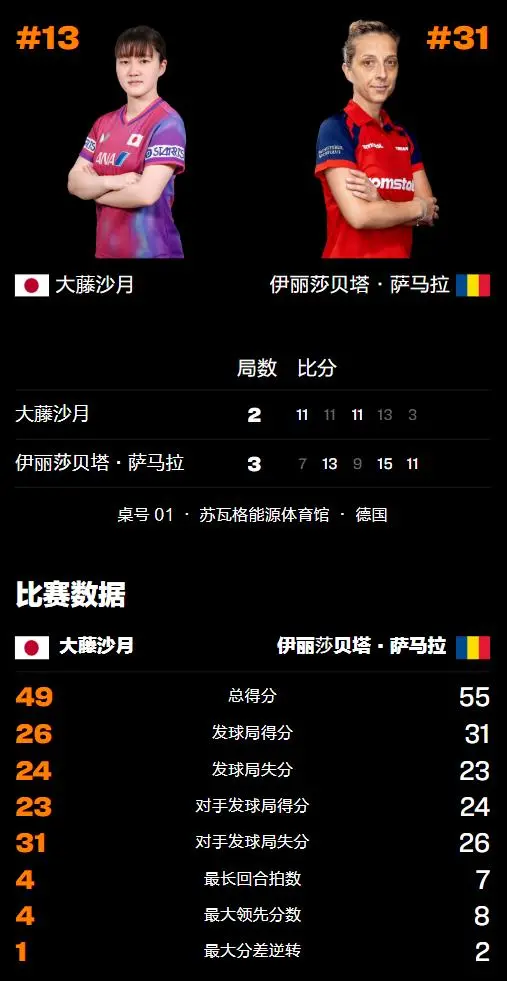 第二局的战况非常激烈,大藤沙月一度7-10落后追至10-10平,紧接着10-11未能再次挽救局点,最终以11-13惜败双方回到同一起跑线。第三局萨马拉开局落后反超比分但未能保持住优势,大藤沙月落后逆转以11-9险胜拿下,距离晋级仅一步之遥。