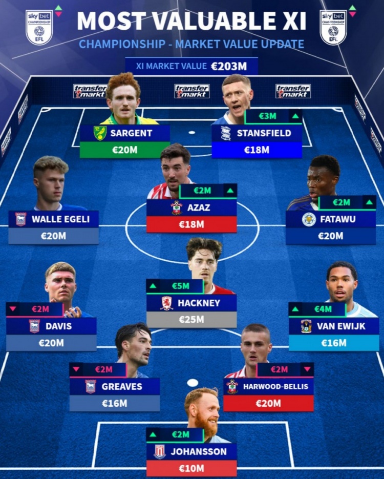 直播吧12月3日讯 德转更新了英冠球员身价,并盘点了英冠身价最高11人阵容,具体如下: