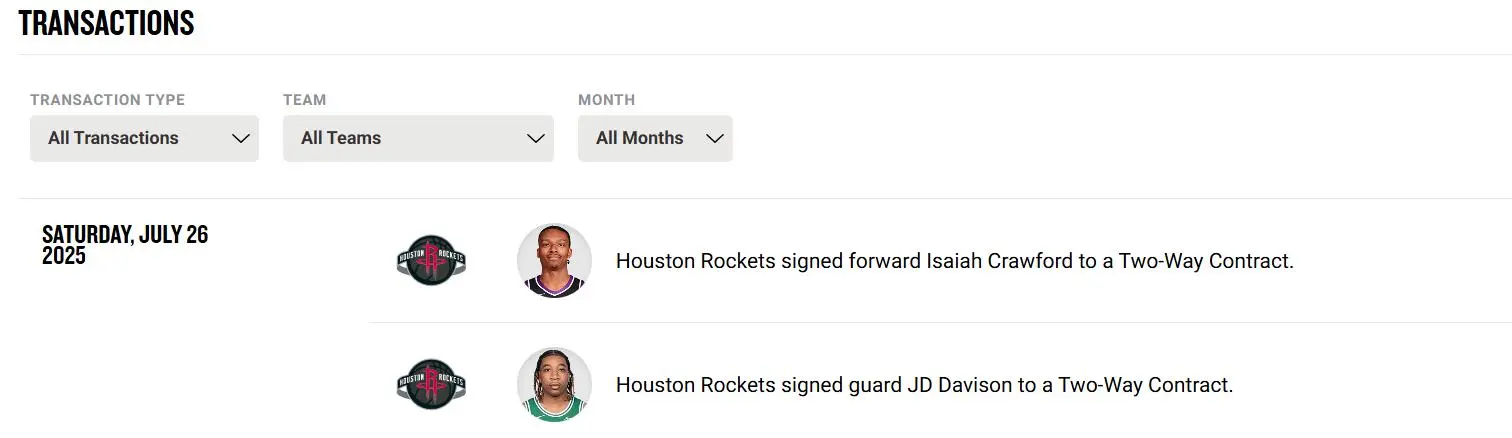 根据NBA官方信息显示,火箭队连续用双向合同签下以赛亚-克劳福德、JD-戴维森两名新援,填满3份双向合同名额。