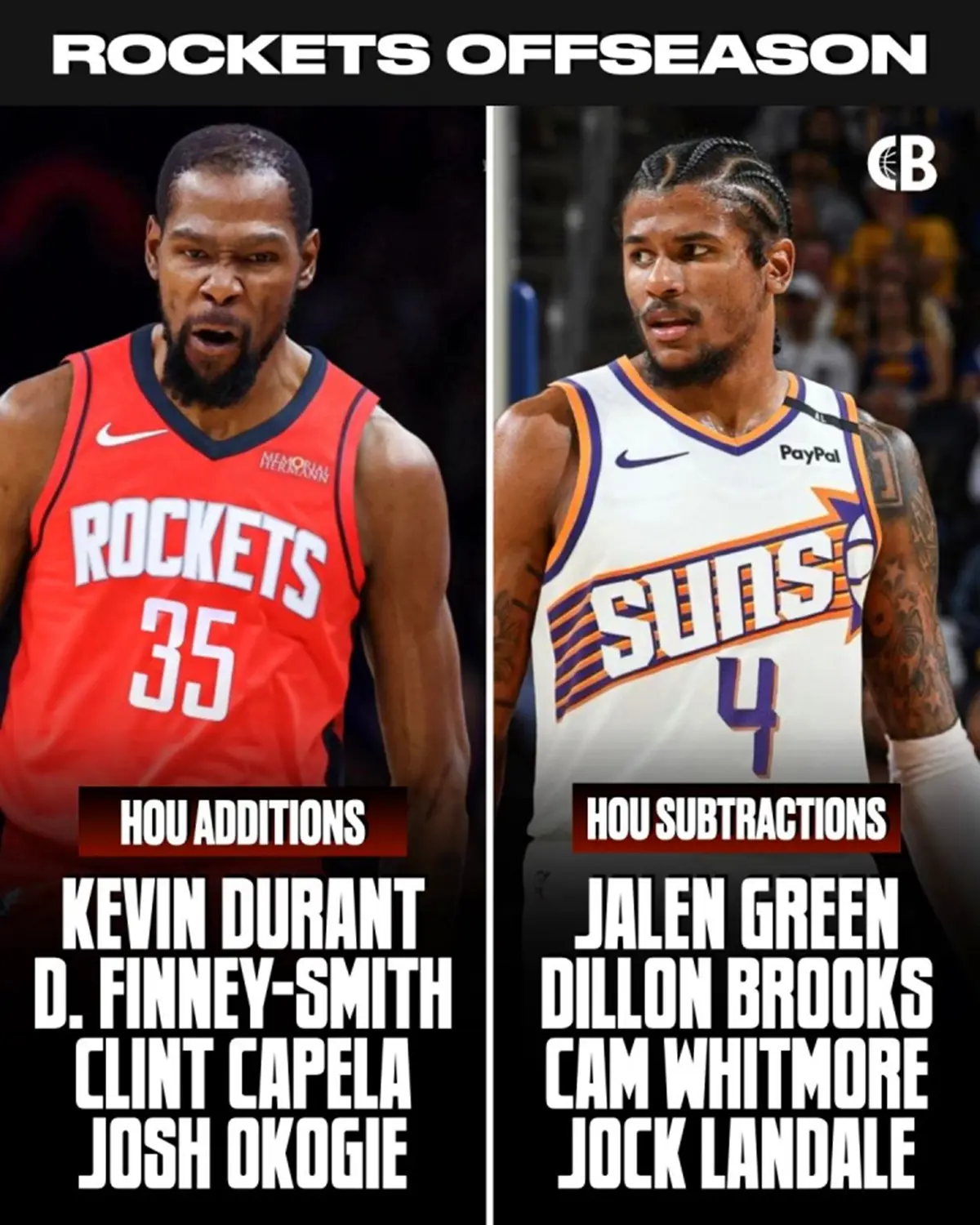 4入:杜兰特(8换1低价获得,解决了关键球能力不足短板)、芬尼史密斯(填补狄龙离队后侧翼3D空缺)、卡佩拉(兰代尔升级版本)和奥科吉(升级侧翼深度)。