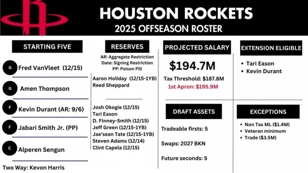 由于使用了全额中产特例,火箭队目前已经触发了1.947亿美元的硬工资帽。