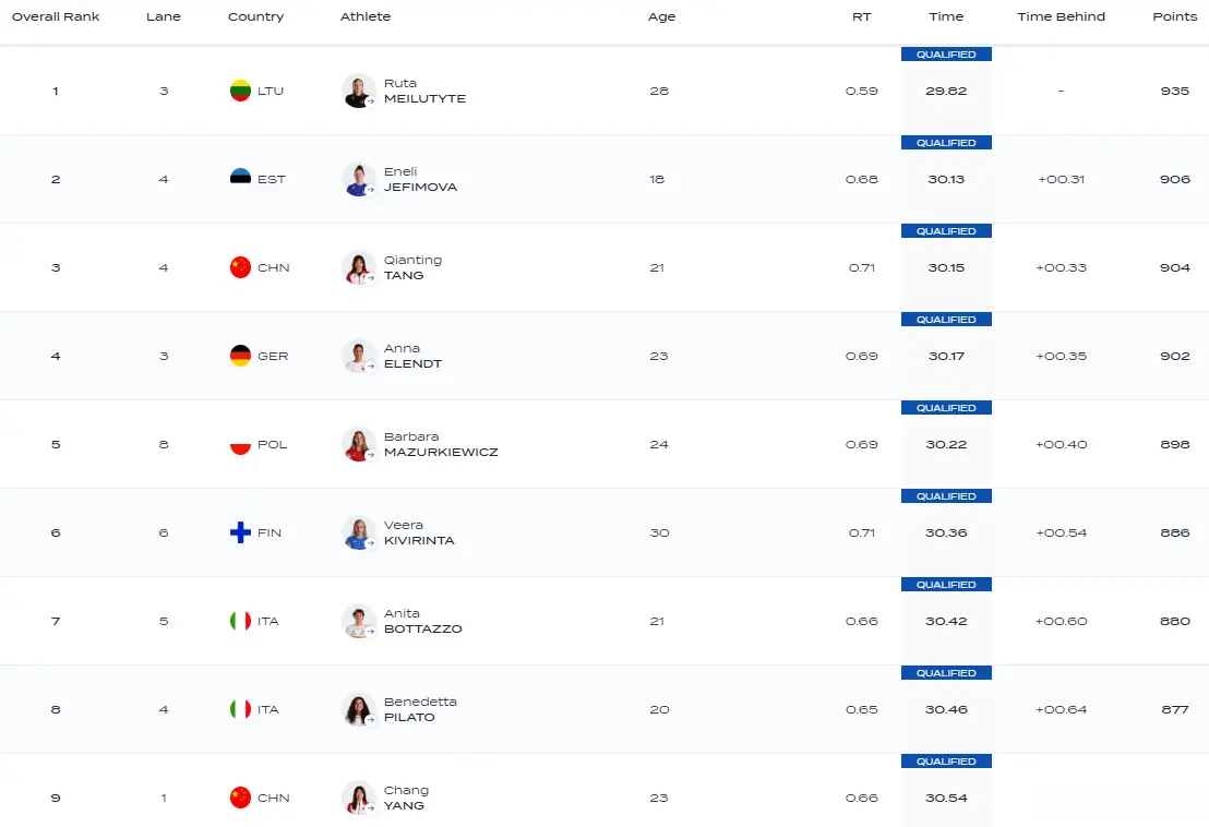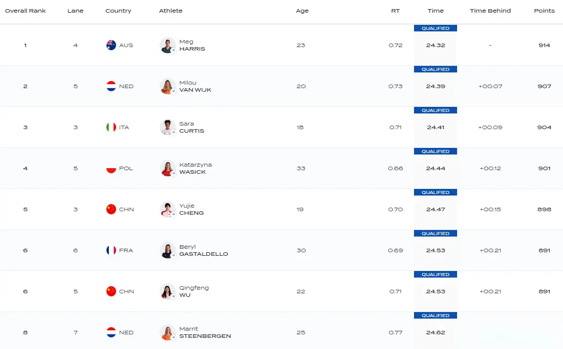 两位中国选手均是第11组出战,程玉洁3道游出24秒47,吴卿风5道则是24秒53,状态调动相当优异,全力以赴收获不错结果,包揽小组前二,总排名第五和第六顺利闯进决赛。