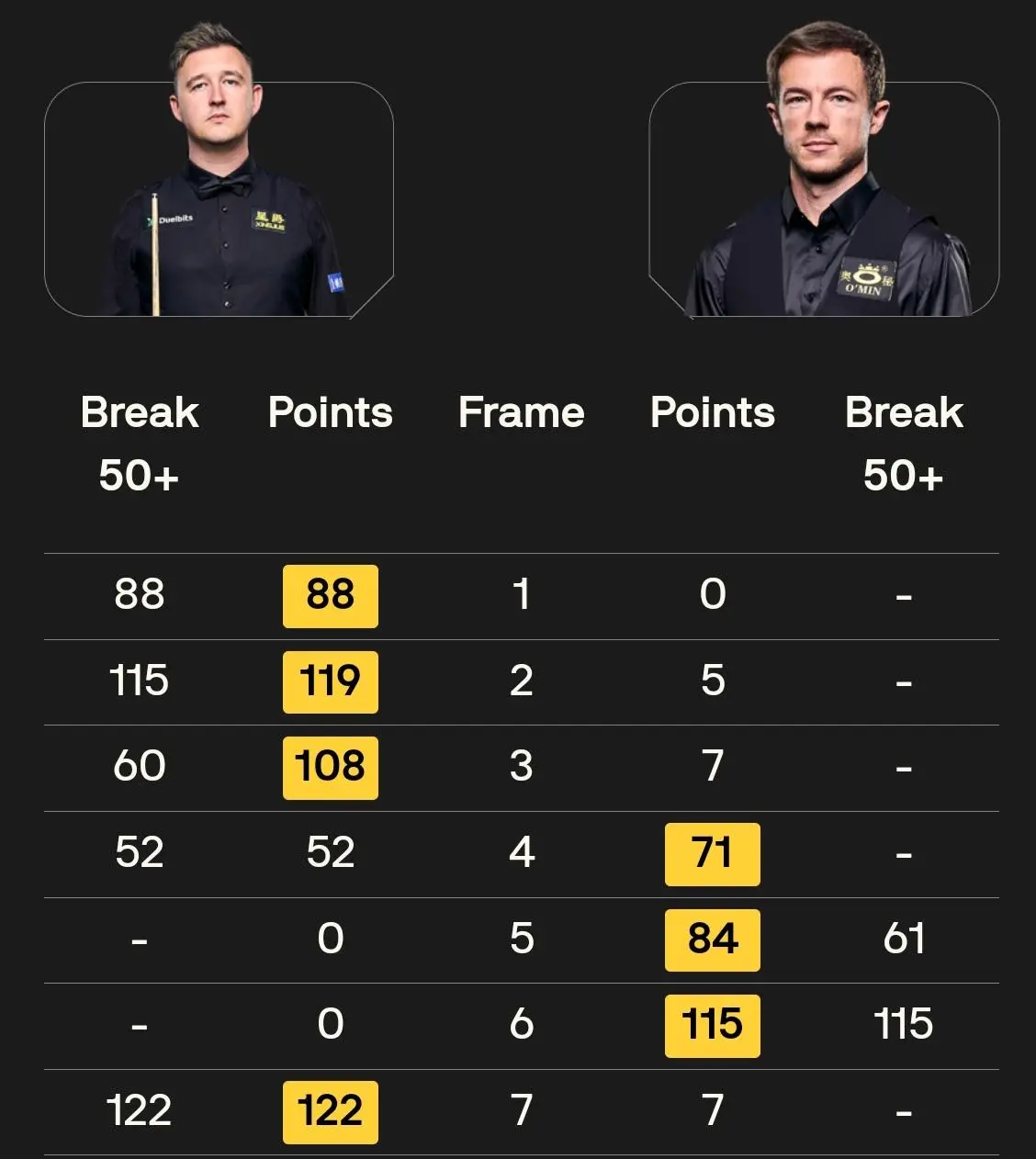 世界排名第二的凯伦威尔逊则是单杆打出88分、115分、60分、52分和122分的表现连胜三局以4-3惊险绝杀利索夫斯基晋级八强。