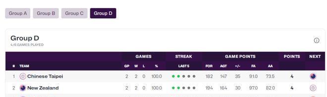 中国台北男篮87-60大胜伊拉克男篮,两战净胜分+35。新西兰男篮94-86战胜菲律宾男篮,两战净胜分+30,从而中国台北男篮净胜分反超新西兰男篮5分,升至小组第一,双方下一场交锋争夺小组第一。菲律宾男篮与伊拉克男篮均是0胜2负,将争夺小组第三的八强资格赛参赛名额。
