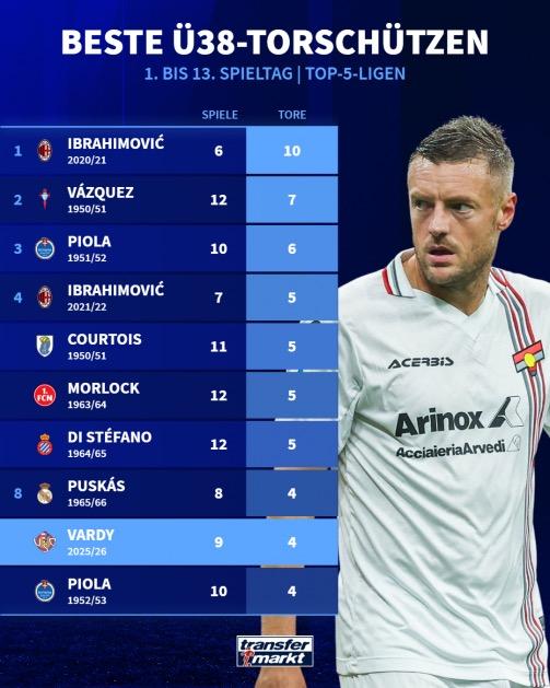 虎扑12月02日讯 德转统计了五大联赛历史上前13轮后,38岁以上球员射手榜。