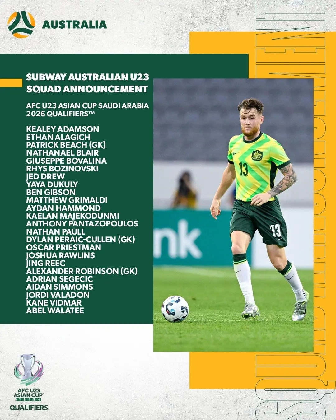 8月25日,前澳大利亚足球名宿、现任澳大利亚U22队主帅维德马尔公布了澳大利亚队24人大名单。适龄留洋球员后卫齐卡蒂(帕尔马,意甲)、马修斯(朴次茅斯,英冠)、前锋伊兰昆达(沃特福德,英冠)、塞戈契奇(朴次茅斯,英冠)、M.图雷(兰讷斯,丹麦超)均被成年国家队征调。6月曾入选的左后卫博斯刚加盟美因茨,球员正在全力拼搏,希望在德甲站稳脚跟,因此此次并未归队。夏窗刚加盟北美大联盟夏洛特FC的前锋古德温,从纽卡斯尔联加盟捷克豪门布拉格斯巴达的南苏丹裔边锋库奥尔,都是同样原因缺席。