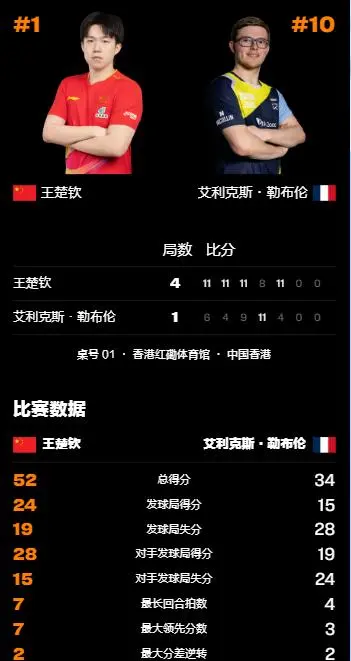 作为如今欧洲最有冲击力的男单选手之一,22岁的艾利克斯勒布伦已经把自己的世界排名提升到了第十位,个人实力不容小觑,不过王楚钦面对艾利克斯勒布伦心理优势明显,在过往二人的2次直接对话中,全部获得了胜利,其中最近的一次交手是在本赛季的重庆冠军赛上,当时王楚钦直落三局横扫获胜。