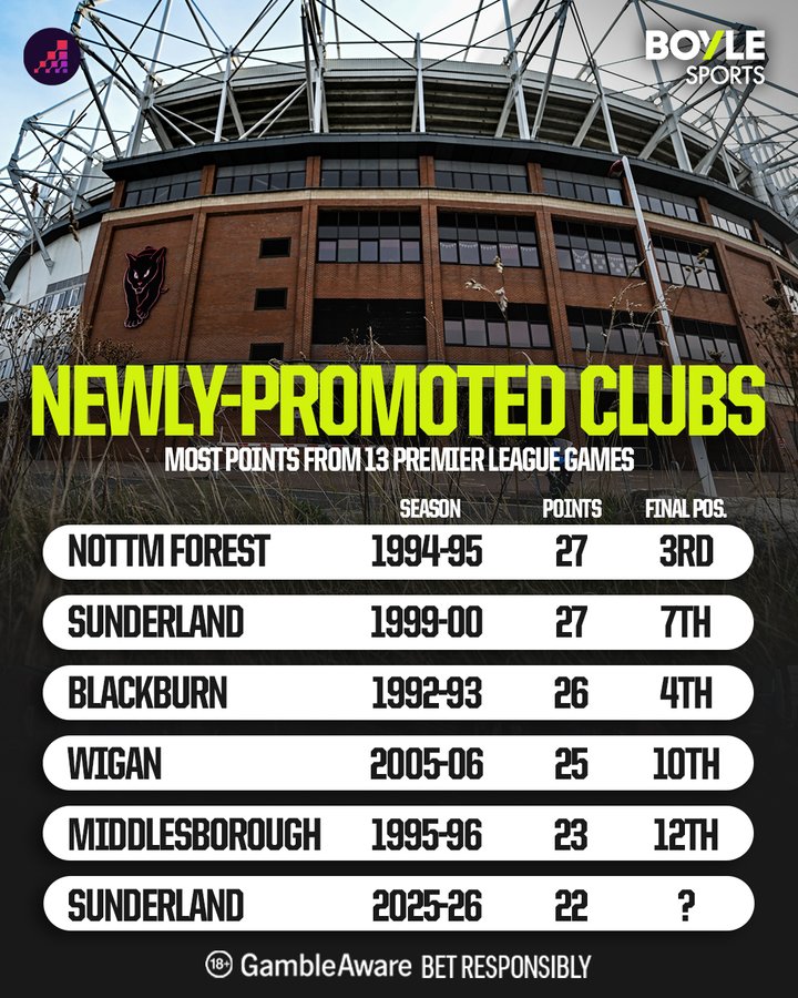 值得一提的是,桑德兰曾在1999-00赛季同样作为英超升班马前13轮英超比赛取得27分,并最终收获了联赛第七名的成绩。
