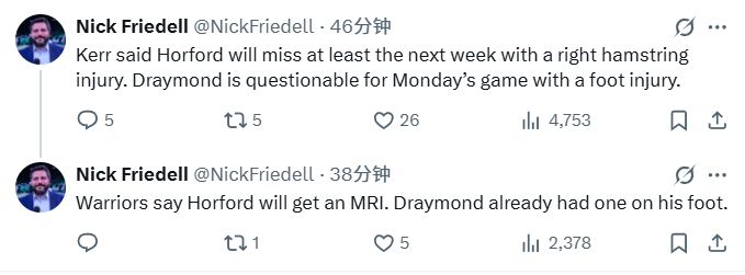 北京时间11月24日,勇士遭遇伤病危机,据主帅科尔透露,霍福德因腿筋伤病将至少缺阵一周,而库明加和追梦也各自有伤在身。