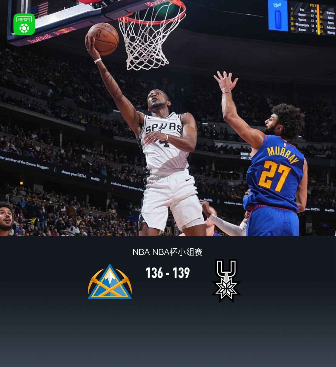 北京时间11月29日NBA NBA杯小组赛,丹佛掘金对阵圣安东尼奥马刺。半场掘金74-59马刺,最终掘金136-139马刺。丹佛掘金贾马尔-穆雷37分4板7助,卡梅隆-约翰逊28分6板1助;圣安东尼奥马刺瓦塞尔35分3板2助,尚帕尼25分10板2助。