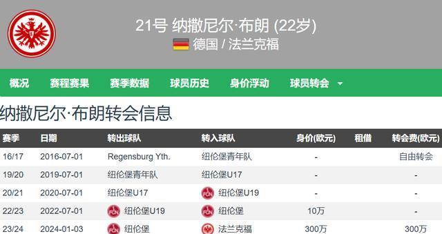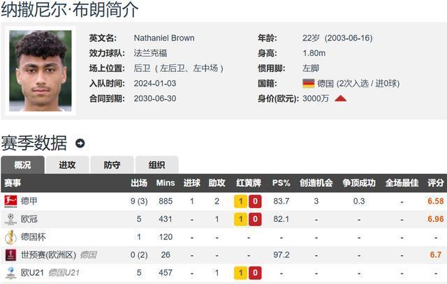 现年22岁的N-布朗,身高1.80,左脚球员,主打左后卫位置,也可以踢左中场,德转估价3000万欧元,现有合同至2030年。N-布朗本赛季至今各项赛事共为法兰克福出场18次,其中15次首发,合计出场1436分钟,贡献1球3助。
